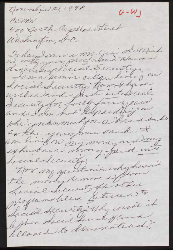 Describes her own experiences on Social Security and asks a question about the administration of Social Security, then criticizes Ken Starr.