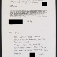 Encloses a previous fax, and adds to it that wealth keeps people from serving in the military, and that the corporate world caused the failure of health reform.