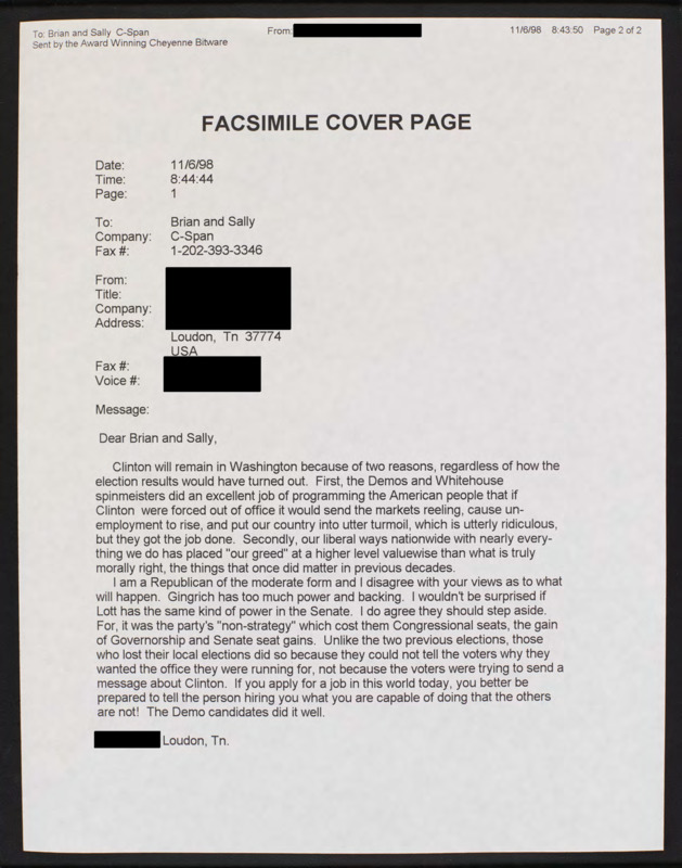 Argues that Bill Clinton will remain in office because Democrats convinced the public his exit would cause financial instability and because the nation is greedy, then criticizes several Republican party leaders for a "non-strategy" costing them Congressional seats.