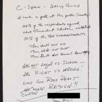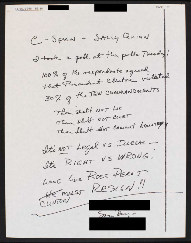 States he took a poll in which every respondent said Bill Clinton broke three commandments, asserts Clinton has done wrong, and praises Ross Perot.
