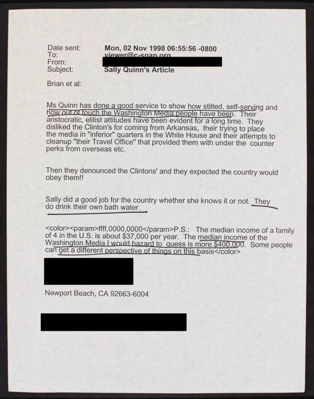 Praises a C-SPAN guest for pointing out how out of touch Washington media people supposedly are, defends the Clintons, and addresses the mean income of U.S. families.