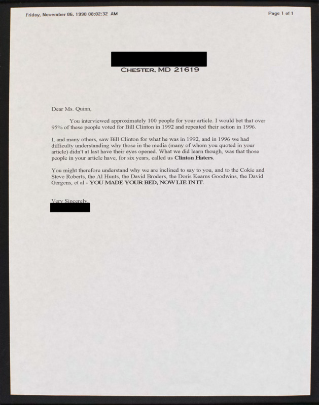 Accuses a C-SPAN guest of only polling Clinton supporters, but states their disapproval of Clinton and expresses no sympathy for those supporters opposed to Clinton after his impeachment.
