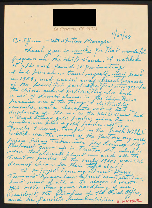 Letter to C-SPAN, 1998-11-27; 91214