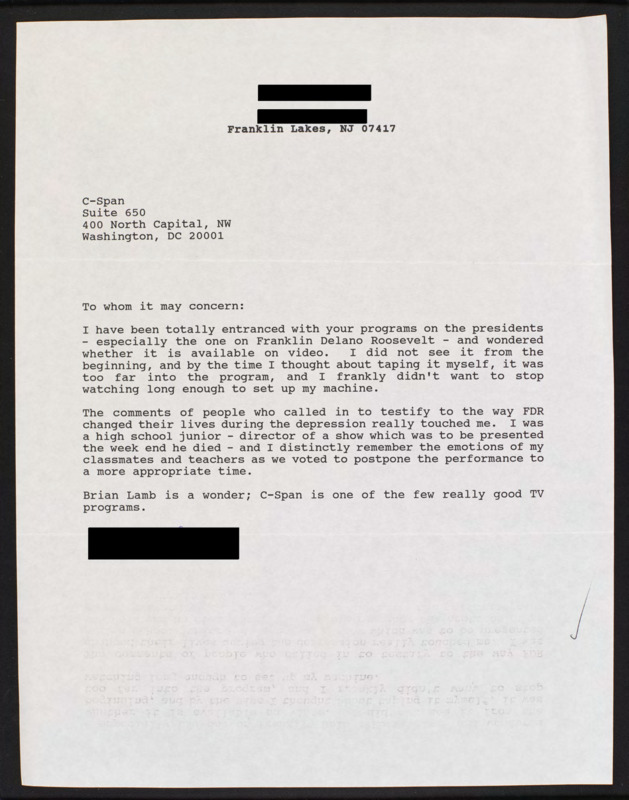 Asks whether the American Presidents programs are available on video tape and remembers Franklin D. Roosevelt.