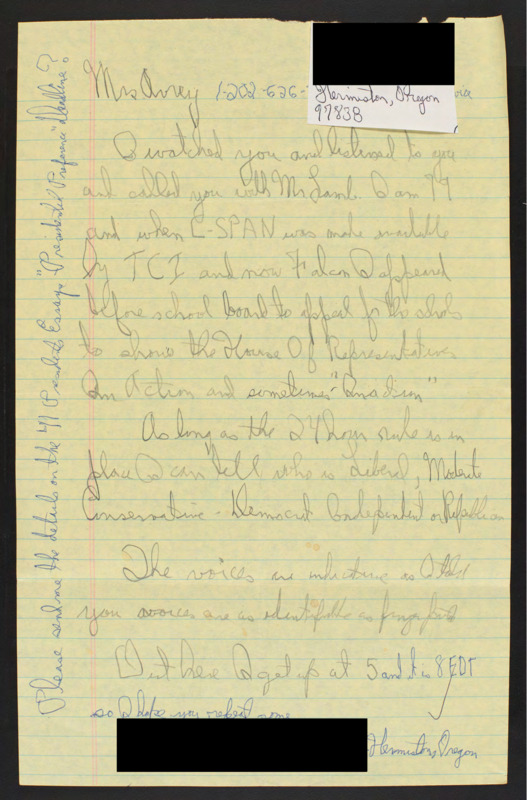 Talks about introduction to C-SPAN and Congressional programming, then asks for information on the American Presidents series contest.