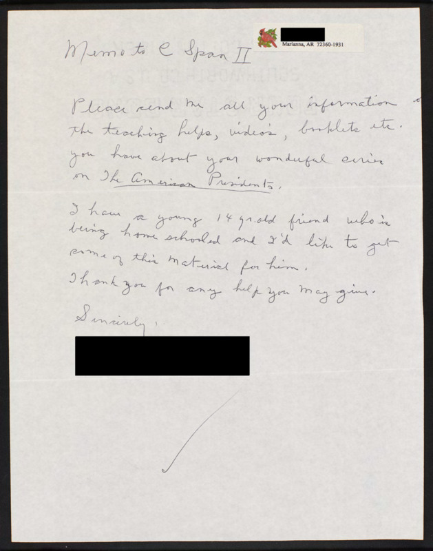 Asks for the information and teaching helps on the American Presidents series on behalf of a home-schooled friend.