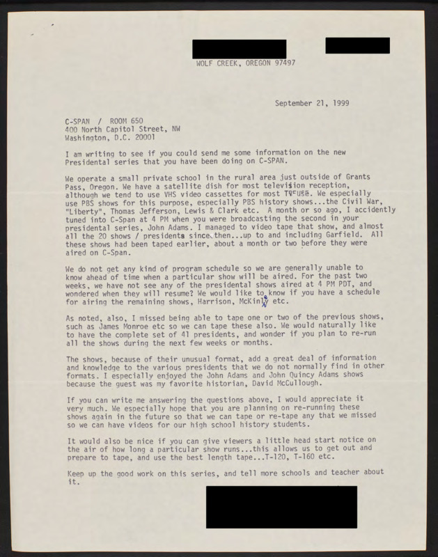 Letter to C-SPAN, 1999-09-21; 97497