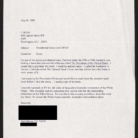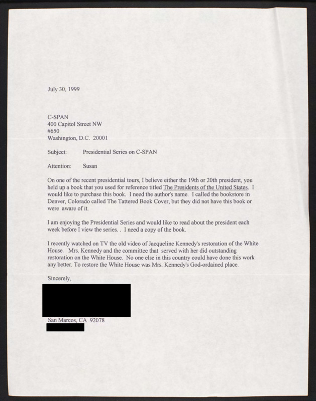 Requests a copy of a book on the U.S. Presidents featured on the American Presidents series, then recalls the video of Jackie Kennedy's renovations of the White House.
