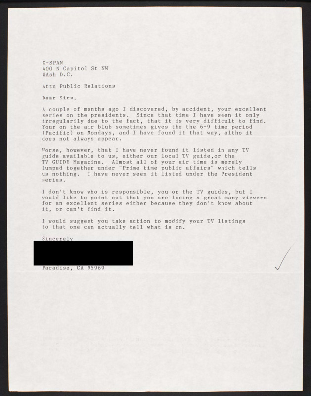 Details difficulties trying to locate the American Presidents series and suggests a program schedule.