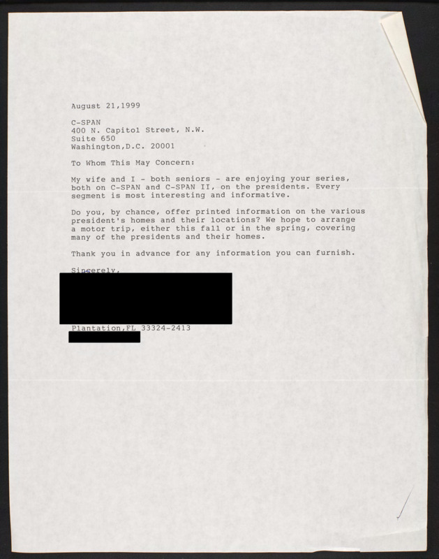 Requests printed information on the presidents' homes and locations so they can plan a road trip.