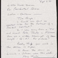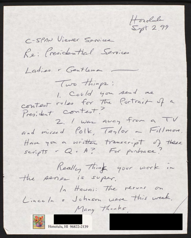 Asks for contest rules for the American Presidents series and for transcripts of the James K. Polk, Zachary Taylor, and Millard Fillmore episodes.