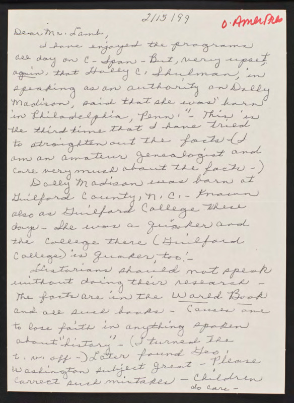 Letter to C-SPAN, 1999-02-15
