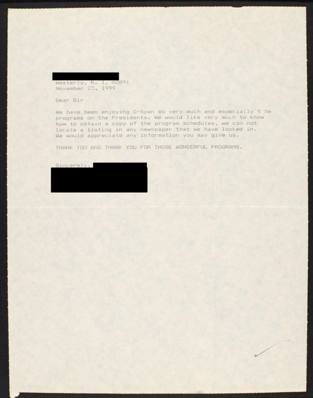 States enjoyment of the American Presidents series and inquires about getting a program schedule.