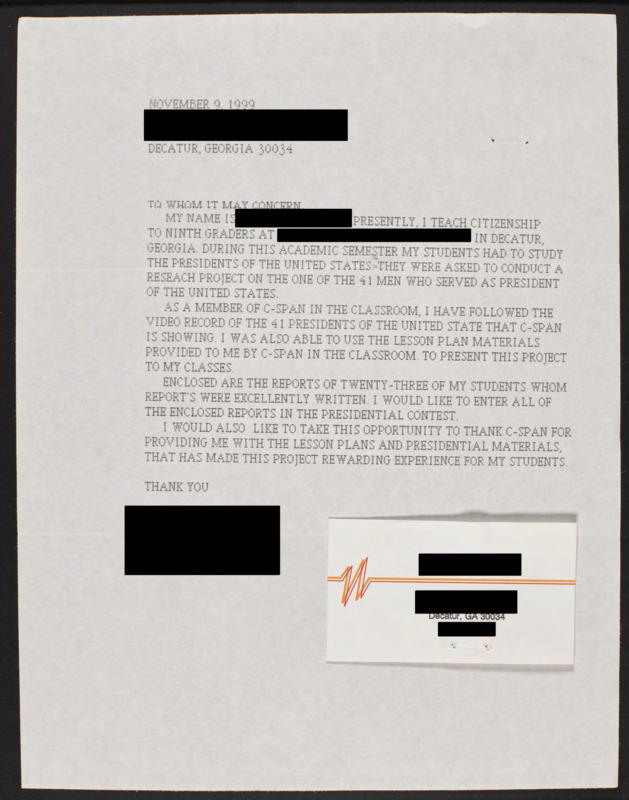 Describes teaching students about the U.S. Presidents using the C-SPAN in the Classroom materials and thanks C-SPAN.