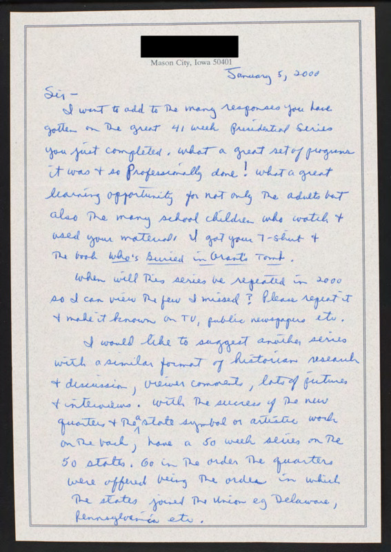 Praises the American Presidents series, asks whn it will be repeated and suggests a series with a similar format on the 50 states.