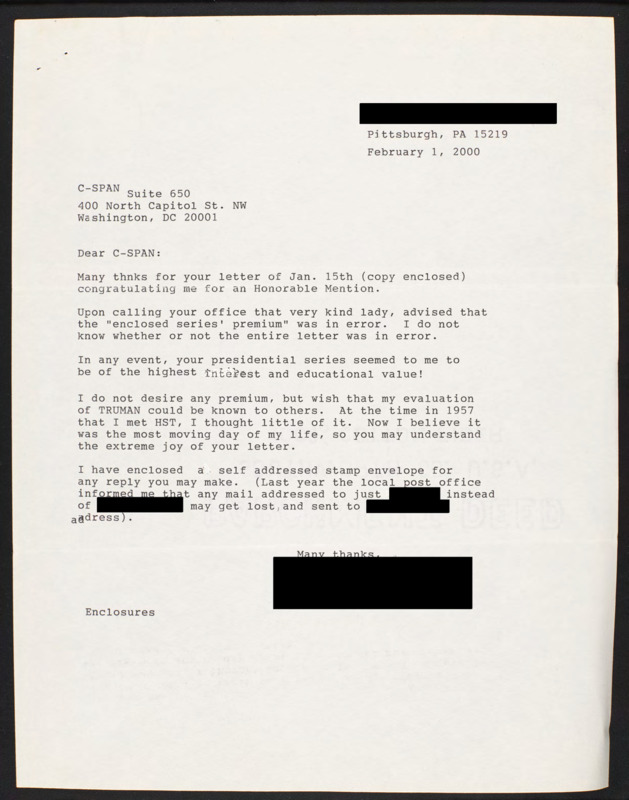 Thanks C-SPAN for a letter, seeks clarification on whether they are an "Honorable Mention," and discusses his entry on Harry S. Truman.