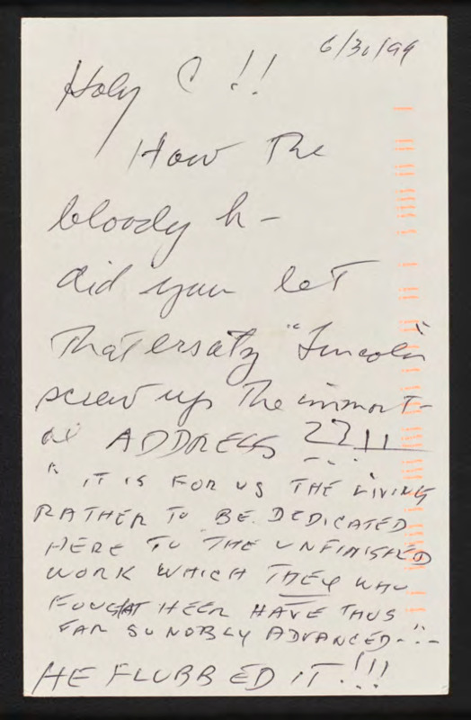 Expresses anger that a Lincoln reenactor "flubbed" a particular speech.