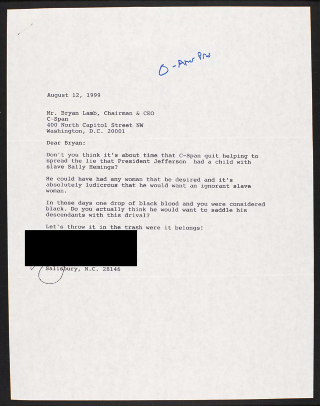 Takes issue with C-SPAN's alleging that Thomas Jefferson had a child with Sally Hemings.