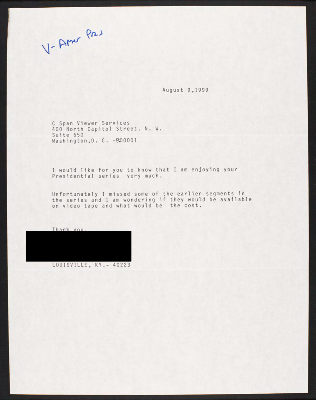 Letter to C-SPAN, 1999-08-09; 40223