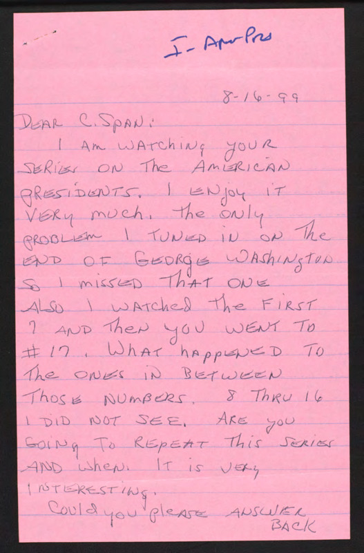 Expresses enjoyment of the American Presidents series but asks if they have missed episodes and if they will repeat the series.
