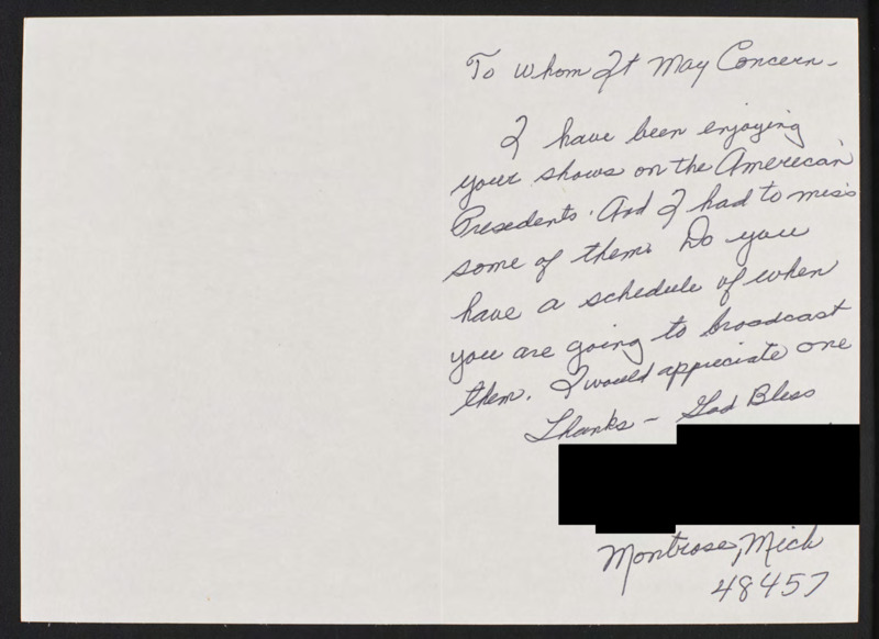 Expresses enjoyment of the American Presidents series and requests a program schedule.
