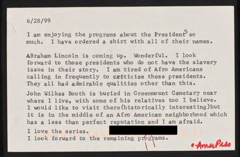 Expresses enjoyment of the American Presidents series, frustration of African-Americans supposedly calling in to criticize presidents, and describes visiting John Wilkes Booth's grave.