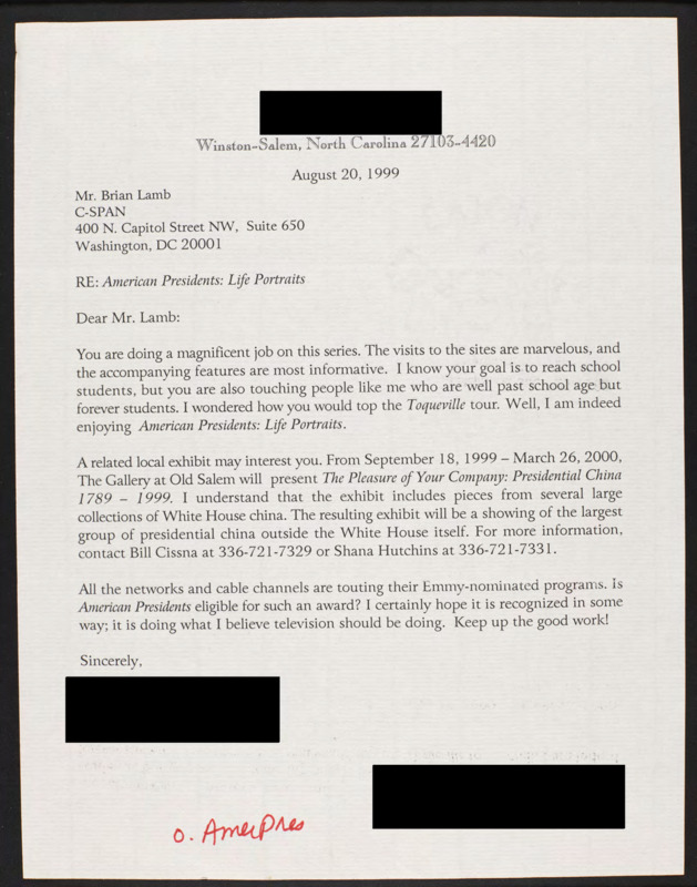 Praises the American Presidents series and states a local exhibit of Presidential china may be of interest.
