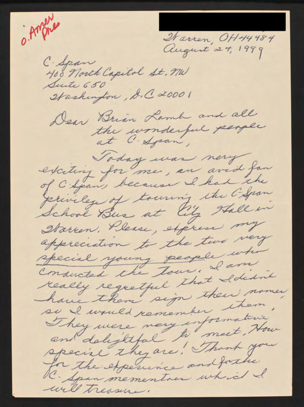 Thanks C-SPAN for the opportunity to tour the C-SPAN School Bus, then describes her enjoyment of C-SPAN programs, including the American Presidents series.