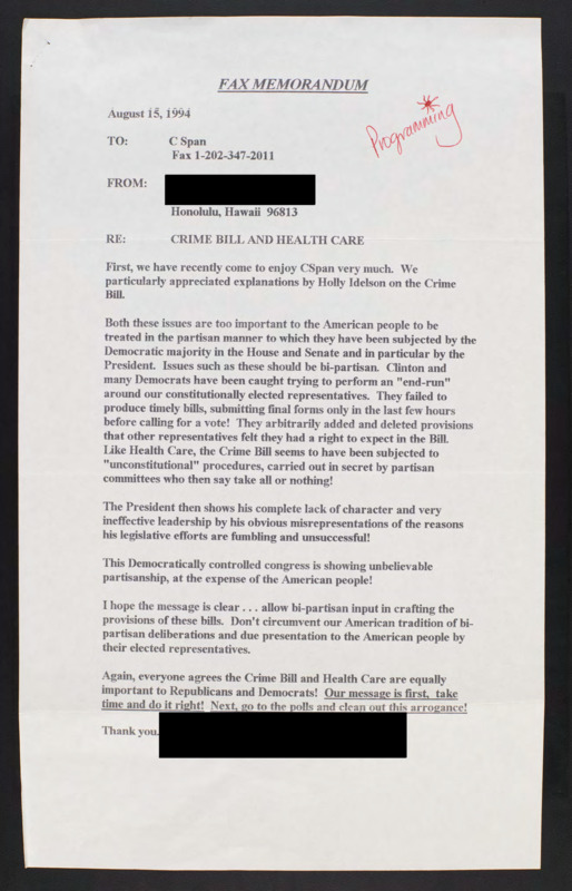 Letter to C-SPAN, 1994-08-15; 96813