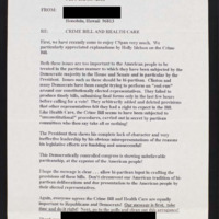 States bi-partisan input should be incorporated in the crime bill and healthcare bill. Claims the bills are undergoing unconstitutional procedures from Bill Clinton and partisan committees.