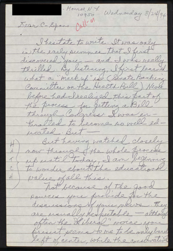 Explains how the network has been educational in understanding bill processes. Says the call-ins have been dominated by an organization that wants to defeat the health care bill and crime bill.