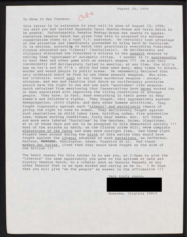 Complains about Orrin Hatch being on C-SPAN because the author disagrees with Hatch's "extreme conservatives" and discusses the proposed assault weapons ban. Continues to discuss opinions on conservatives denying women rights and fighting segregation. Asks that liberals be given a chance to speak.
