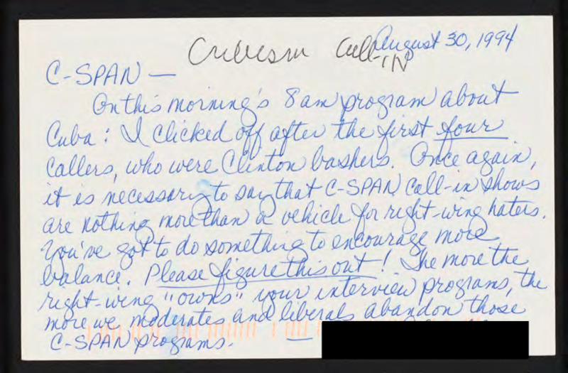Says they turned off a call-in program because the callers "bashed" Clinton. Asks for the network to promote more balance or it will lose moderate and liberal viewership.