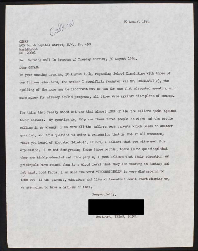 Letter to C-SPAN, 1994-08-30; 78381