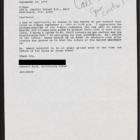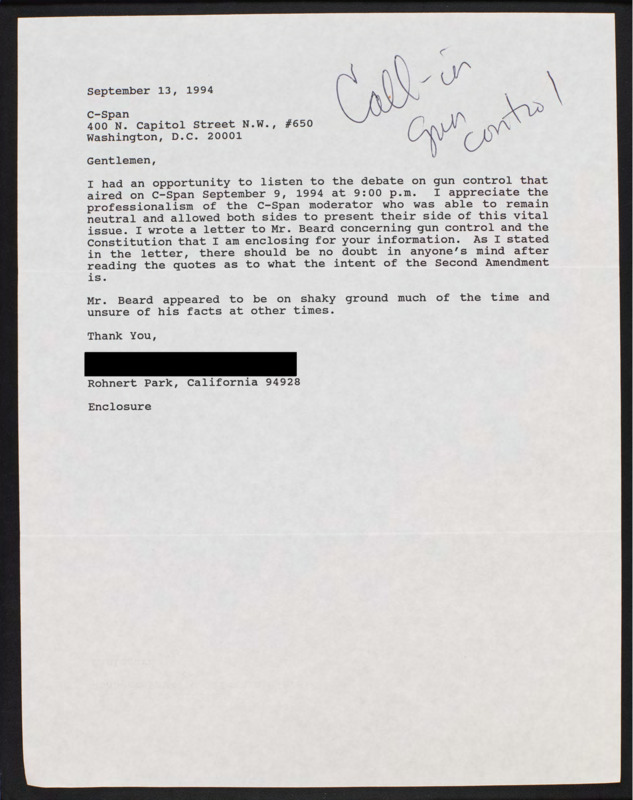Thanks the moderator during a debate on gun control for remaining neutral. Mentions an attached letter that would clarify the intent of the second amendment.