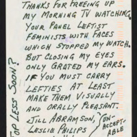 Dislikes the "leftist feminists" on the panel. States if "lefties" are to be invited then to choose attractive ones.