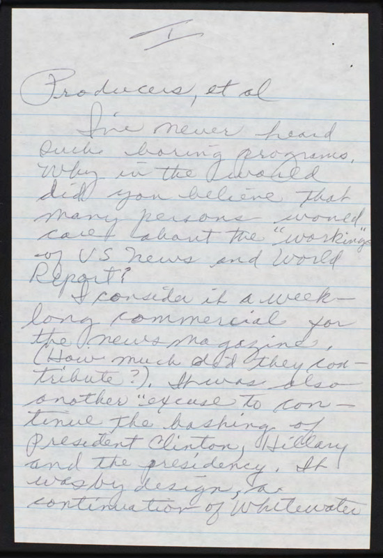 Complains about a program relating to the news and says it was a weeklong advertisement for news magazines. Claims it was an excuse to continue bashing Bill and Hillary Clinton.