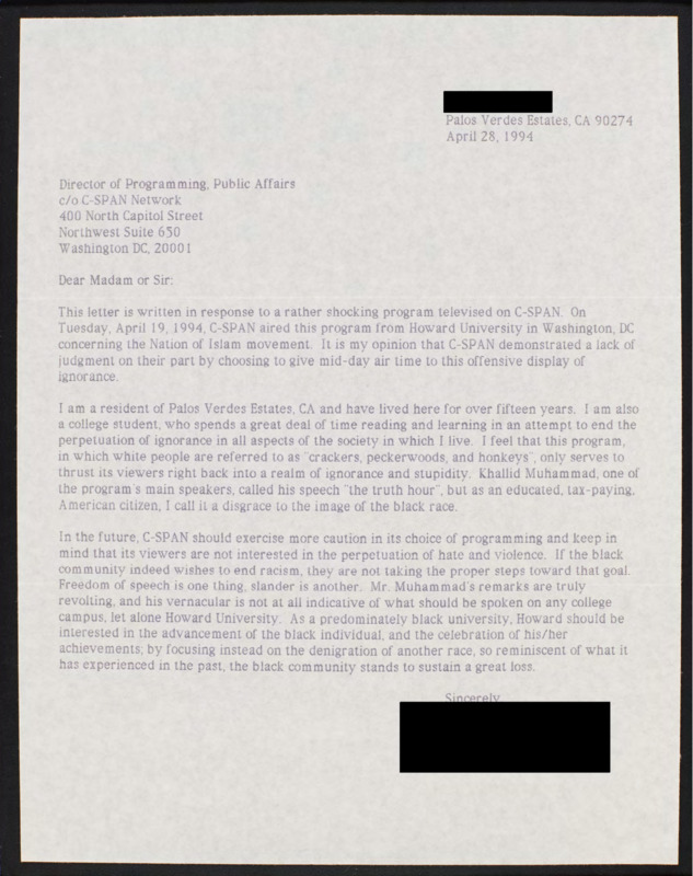 Dislikes that the network televised a Nation of Islam event because they found it offensive. Claims the program was a disgrace "to the image of Black people" and believes Black universities should celebrate Black achievements than focus on the past.