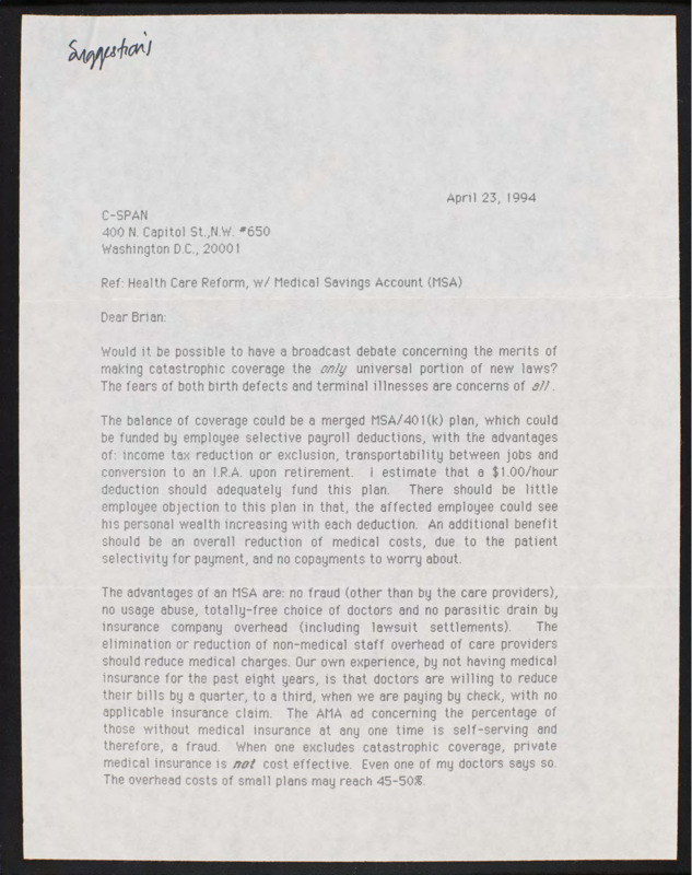 Letter to C-SPAN, 1994-04-23; 92665
