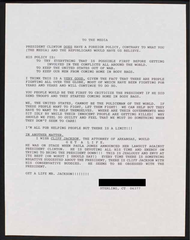 Defends Bill Clinton's foreign policy against the media and Republicans. Criticizes Cliff Jackson for his support of Paula Jones.