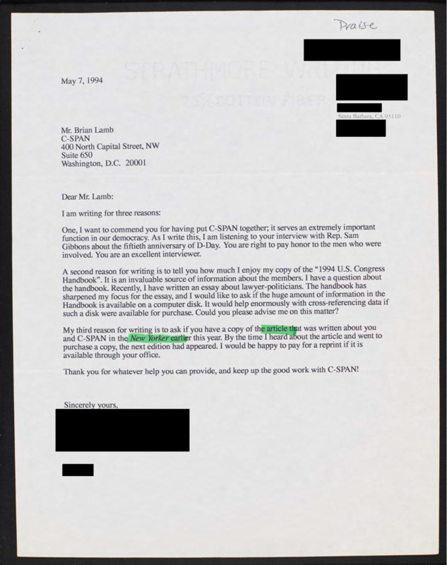 Commends the network, enjoys their copy of the 1994 U.S. Congress Handbook, and requests a copy of an article about Brian Lamb in the New Yorker.