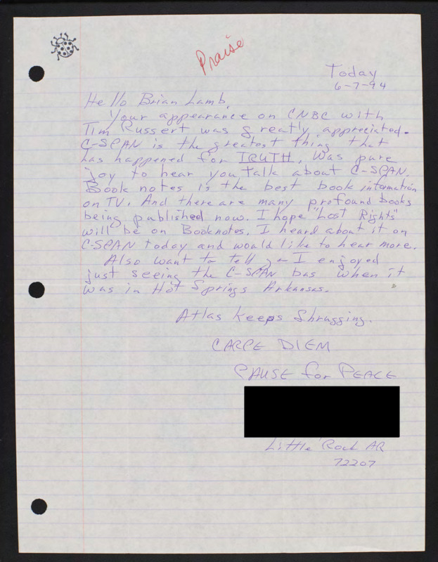 Appreciates Brian Lamb's appearance on CNBC and recommends for Booknotes "Lost Rights: The Destruction of American Liberty."