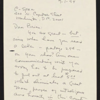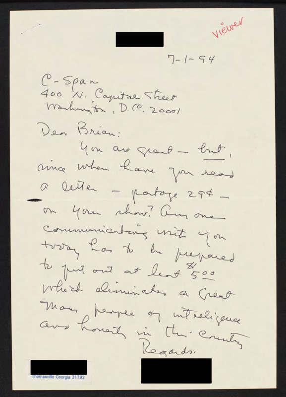 Asks the last time Brian Lamb read a viewer's letter on a program because calling is expensive.