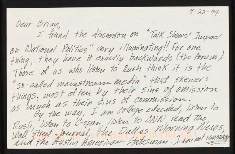 Responds to a forum by asserting they are not ignorant. Says they are college educated and they listen to Rush Limbaugh, CNN, and other news sources.