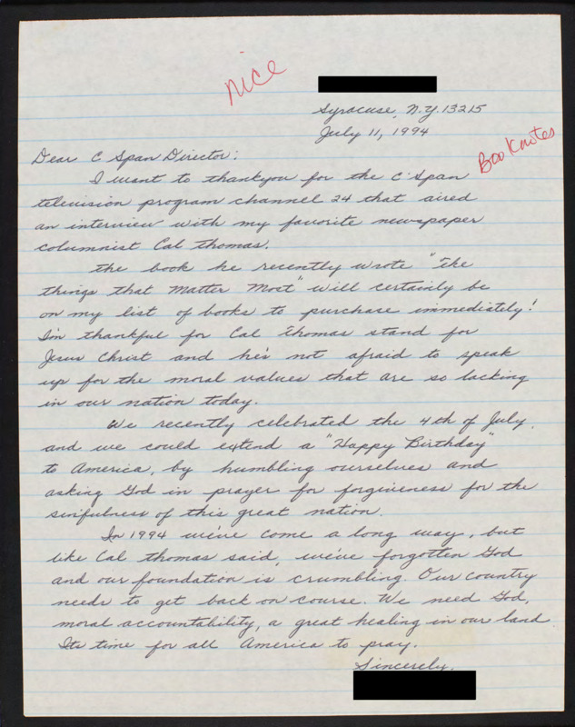 Praises Cal Thomas for supporting Jesus Christ and for moral values. Agrees with Thomas' assertion the country has forgotten God.