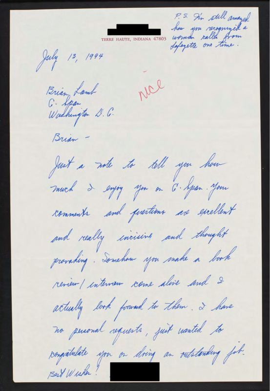 Praises Brian Lamb for asking thought provoking questions. Congratulates Lamb on for being outstanding on the network.
