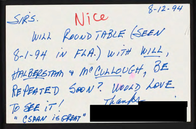 Asks if the program with David Halberstam, George Will, and David McCullough will be repeated.