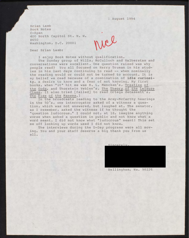 Describes the Booknotes program with David Halberstam, David McCullough, and George Will as excellent. Explains how embarrassed they would be if they were interrogated in an Army-McCarthy hearing and didn't understand a word used.