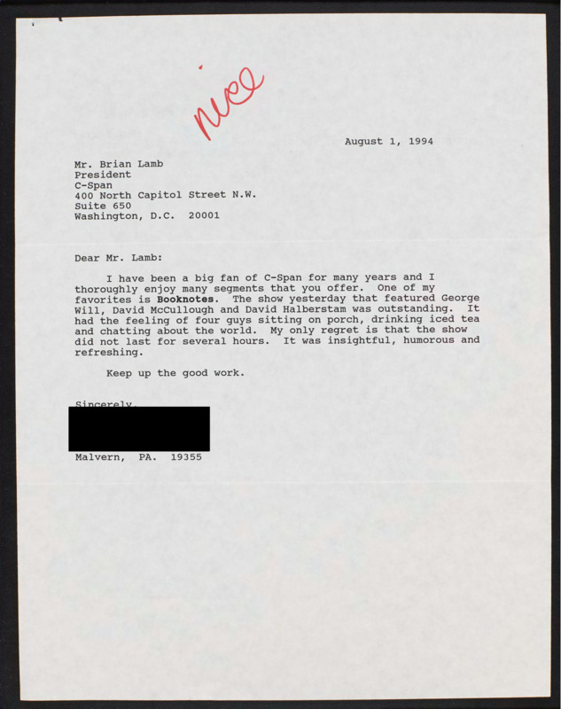Praises the Booknotes program as their favorite and refers to the program with David Halberstam, David McCullough, and George Will as insightful.