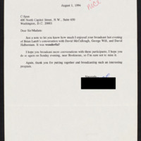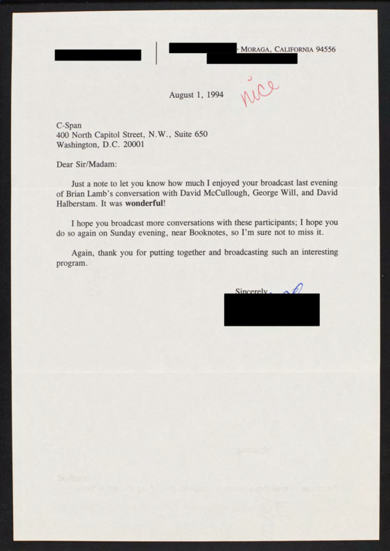 Praises the program with David Halberstam, David McCullough, and George Will.